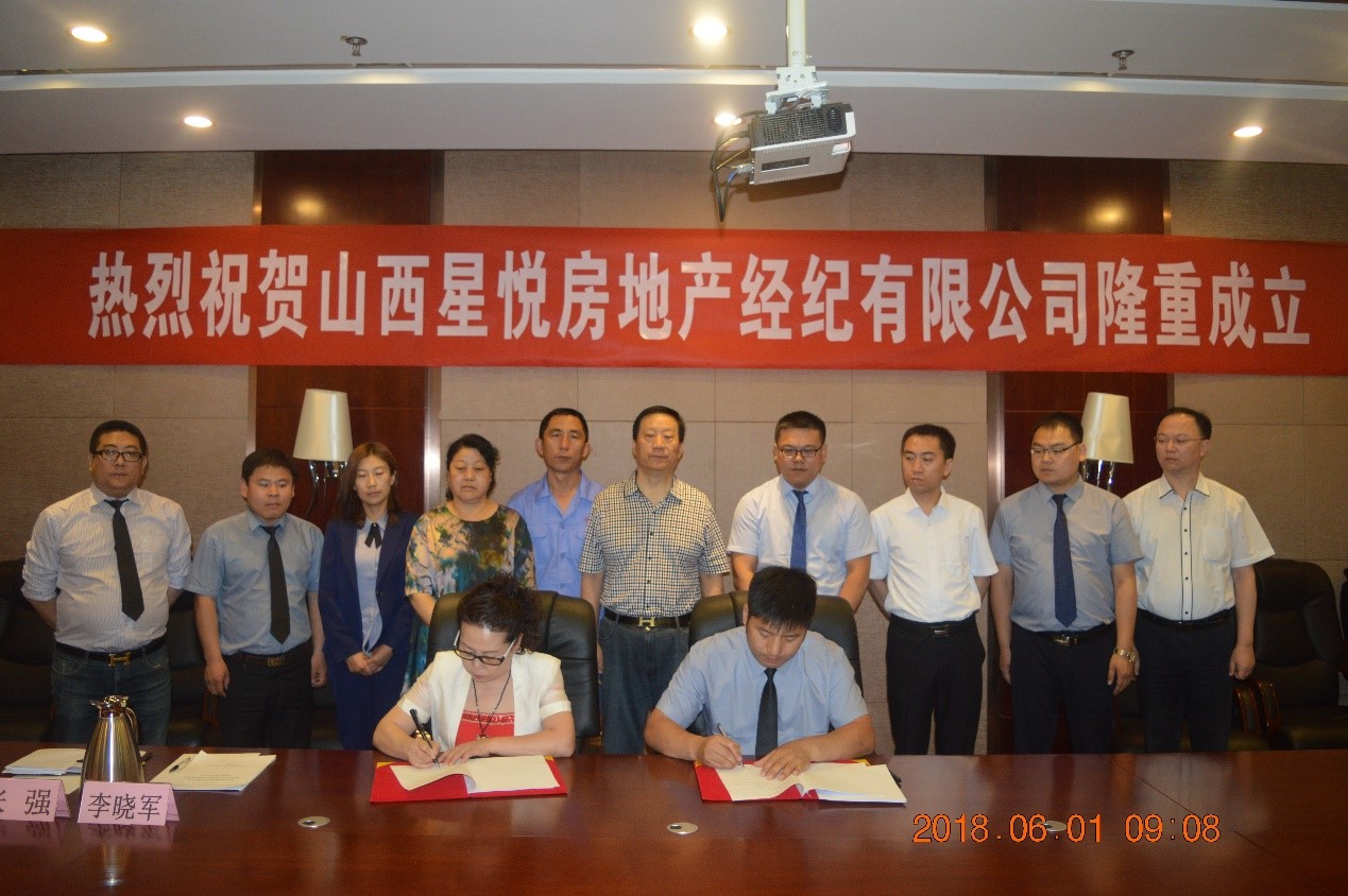2018年6月1日上午9時,“山西星悅房地產經紀有限公司成立大會暨簽約儀式”在星雅名都酒店4樓會議廳隆重舉行。集團董事長總裁郭秀忠、副總裁王文萍、郭雅維、董事長助理沈習寧、經紀公司總經理冉賢俊、監(jiān)事劉斌等領導出席了大會。